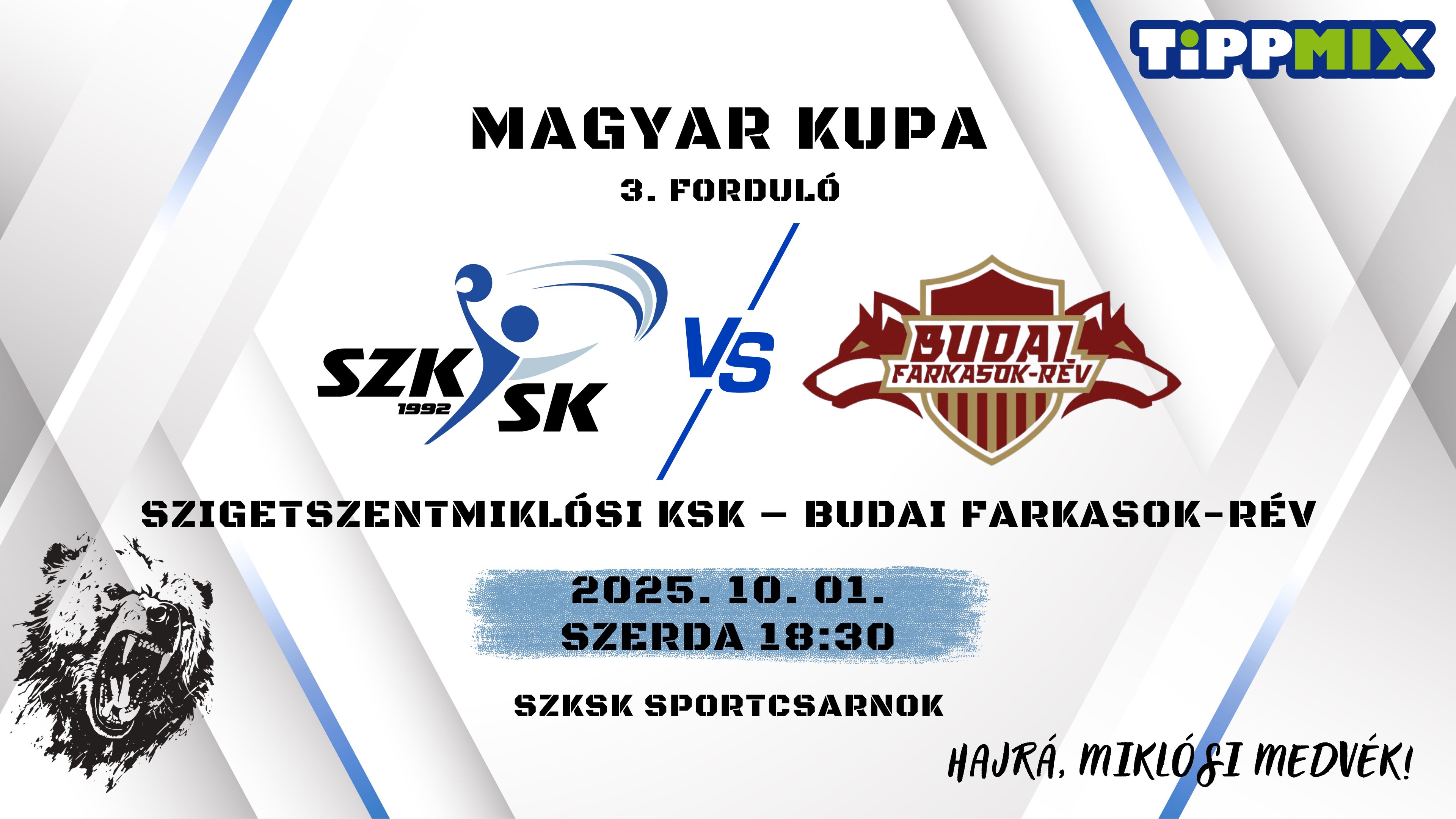 Szerdán este a Magyar Kupában is pályára lép a Szigetszentmiklósi KSK férfi kézilabdacsapata. A 3. fordulóban a Budai Farkasok-Rév együttesét fogadják a Miklósi Medvék az SZKSK Sportcsarnokban.