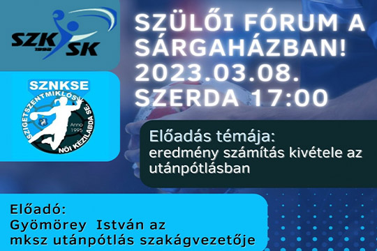SZNKSE szervezőivel karöltve szülői fórumra hívjuk Önöket, melyet Gyömörey István a Magyar Kézilabda Szövetség utánpótlás szakágvezetője tart.